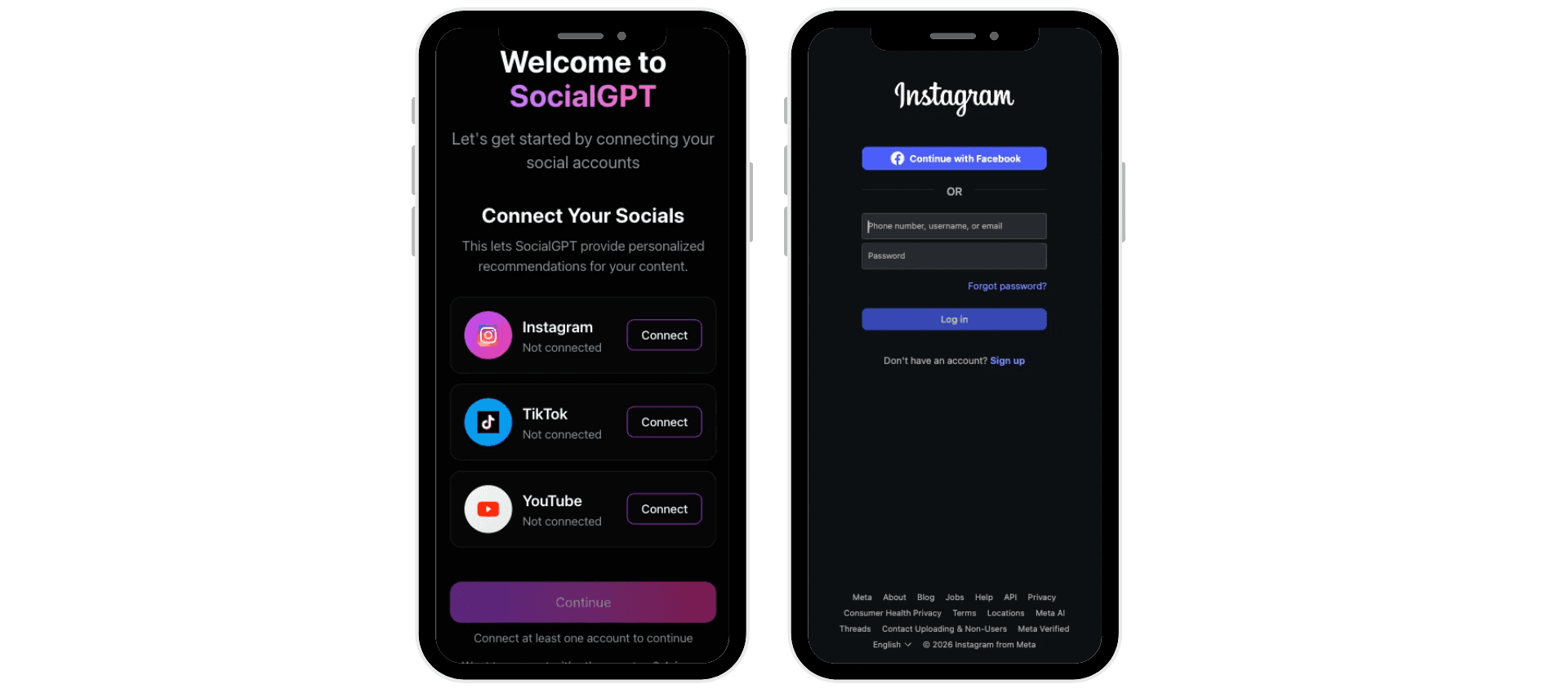 After signing up for SocialGPT you will be prompted to connect at least one account