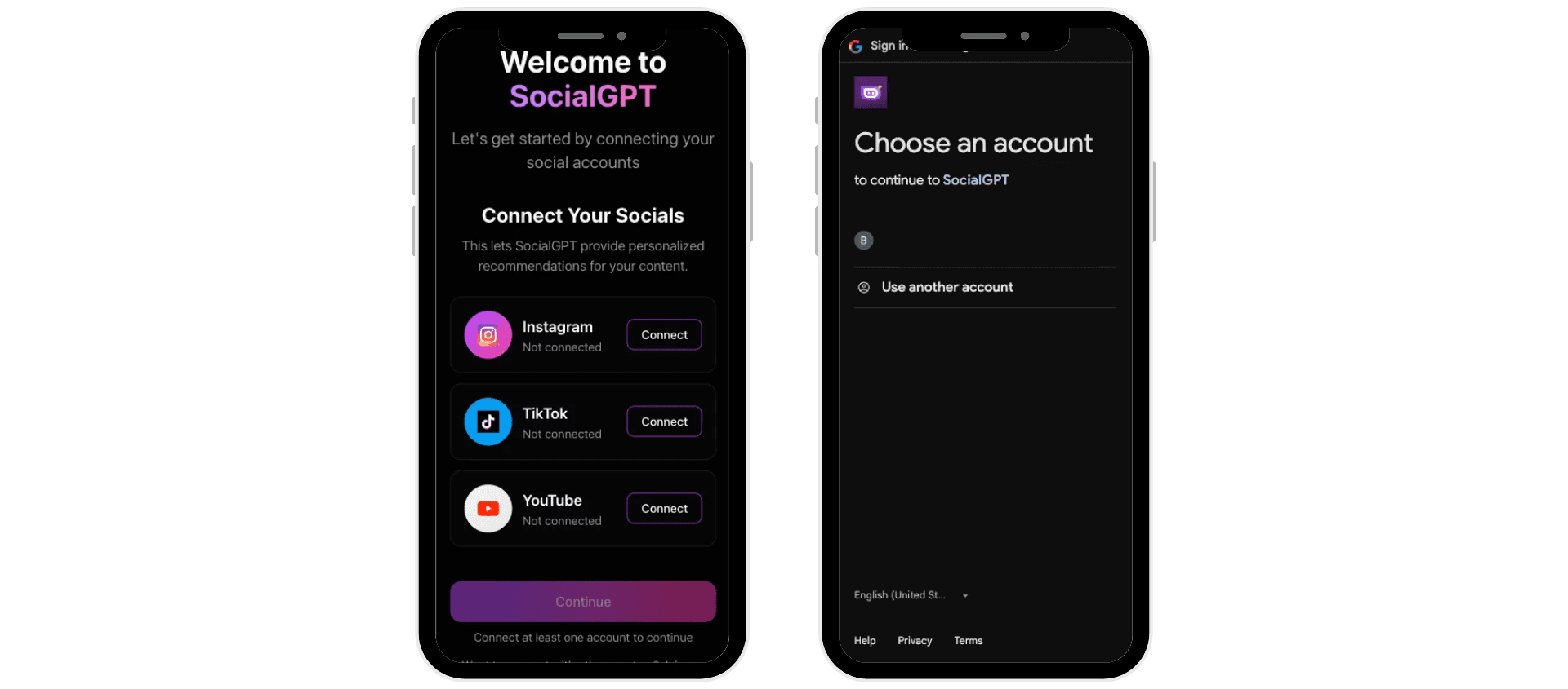 After signing up for SocialGPT you will be prompted to connect at least one account