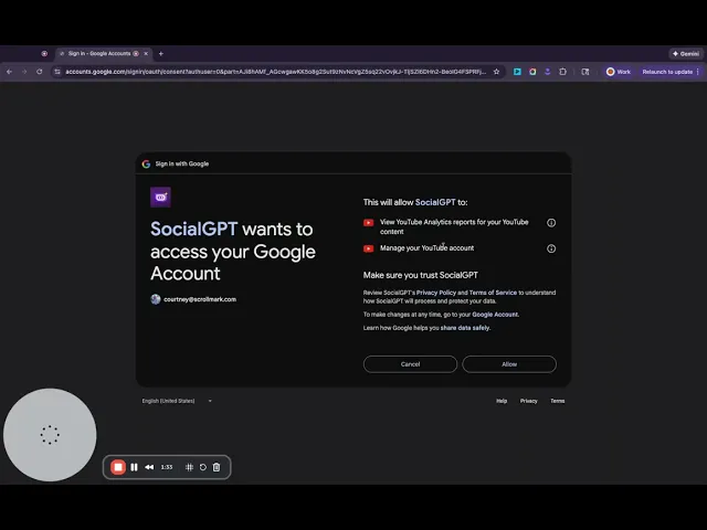 Connecting your YouTube account allows SocialGPT to analyze your performance, tailor video ideas to your niche, and power features like Post Coach and Video Analysis.