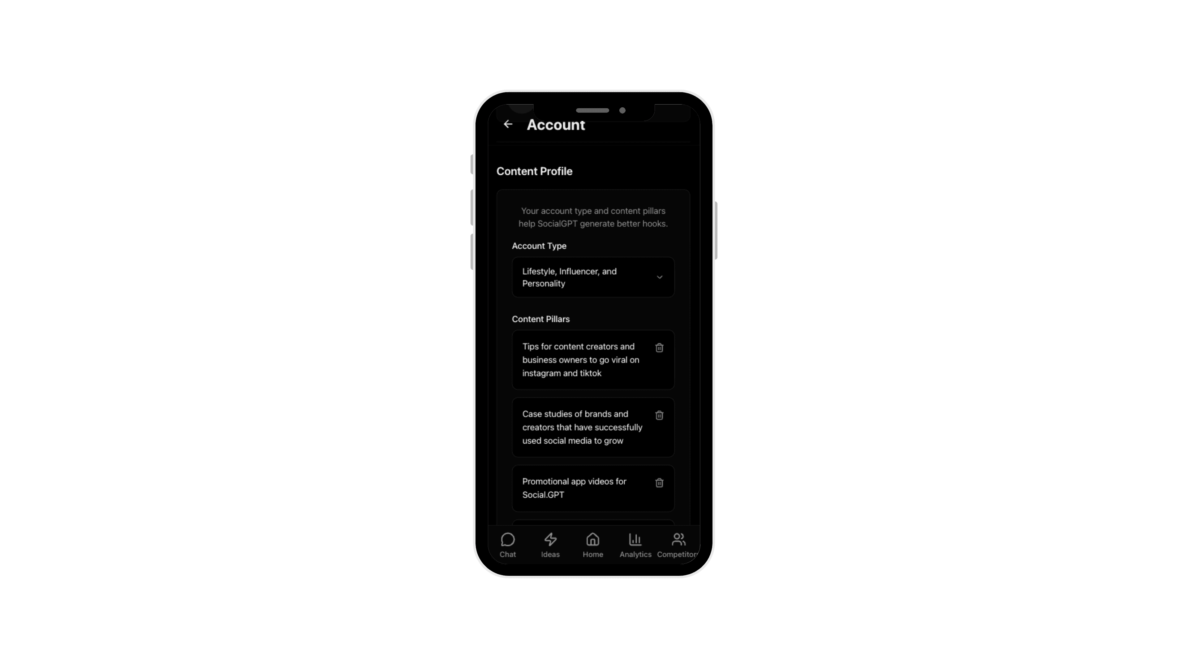 Content PIllars shape everything: your Ideas feed, Chat suggestions, and what SocialGPT considers "relevant" when analyzing competitors or coaching your posts.