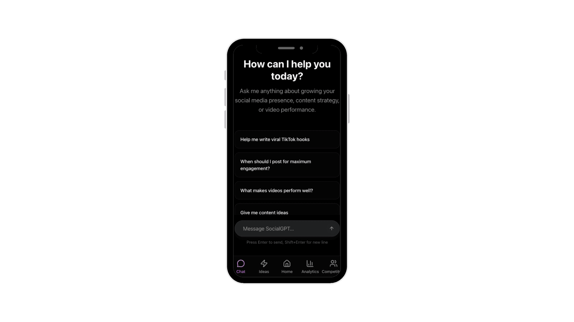 Navigate to the Chat Tab to ask your AI content coach about content strategy, viral hooks, or the best time to post. Get personalized advice in seconds.